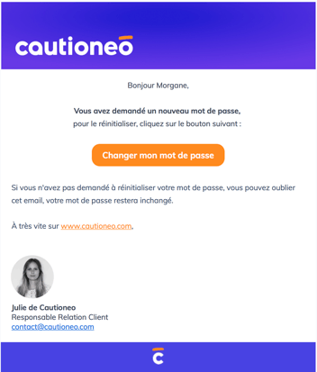 - Consultez votre boîte mail (vérifiez vos indésirables, si le mail n'a pas été réceptionné après quelques minutes) et ouvrez le mail avec les instructions. Cliquez sur "Changer mon mot de passe"